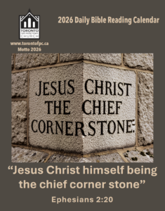 The 2026 Bible reading calendar is now available. If you would like a copy mailed to you, please send a request to info@torontofpc.ca. You can view and print a copy by clicking on this link: 2026 Bible Reading Calendar. “Many books in my library are now behind and beneath me. They were good in their way once, and so were the clothes I wore when I was ten years old, but I have outgrown them. Nobody ever outgrows Scripture; the book widens and deepens with our years.” – C.H. Spurgeon. |